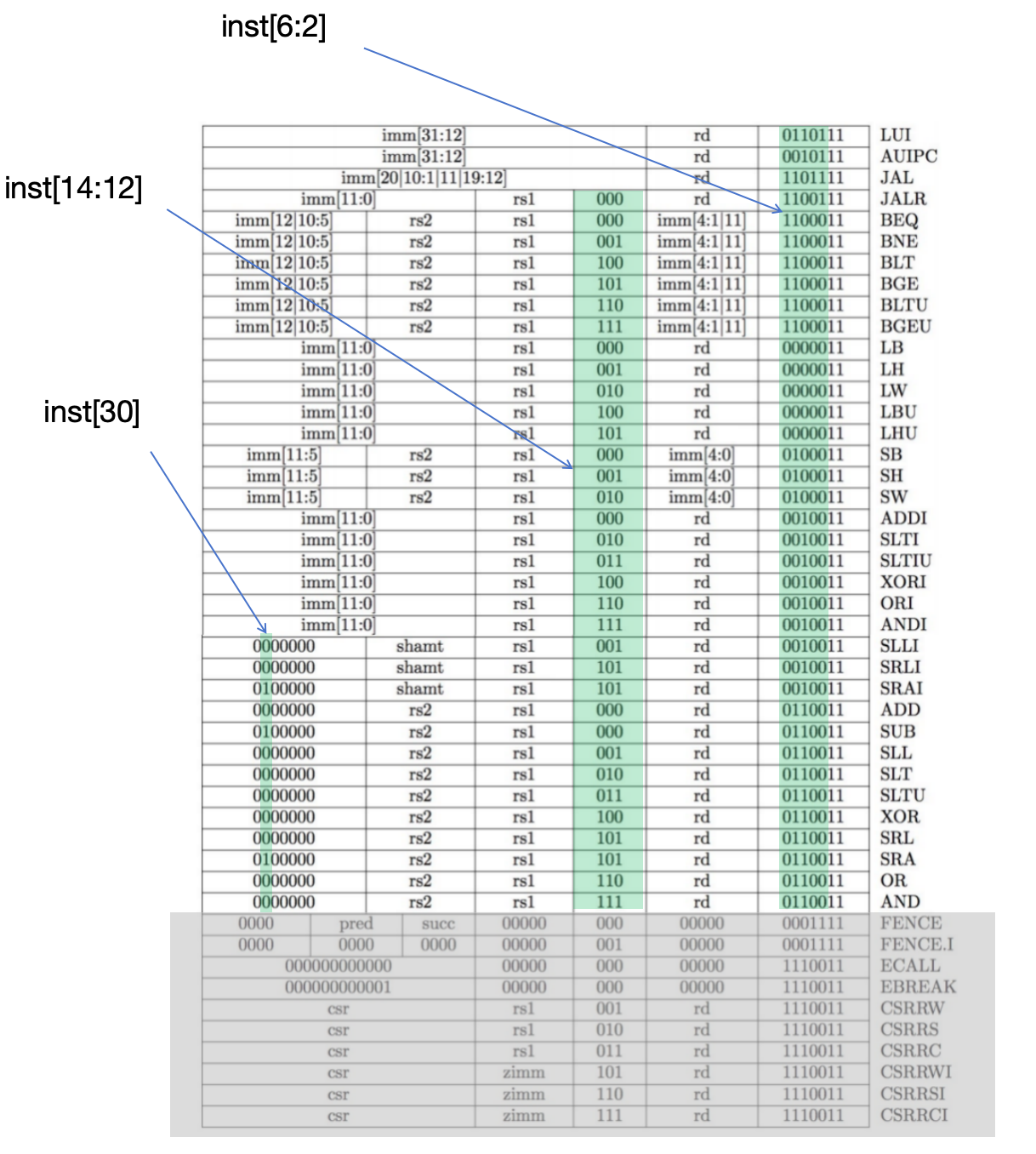 RV32I is basically a nine bit ISA. If you get stuck, check my [implementation](https://github.com/byrzhm/SimpleRV/blob/main/single-cycle/src/controller.sv).